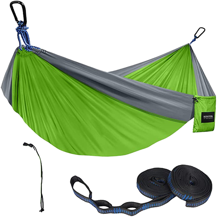 Egyszemélyes kültéri kemping ejtőernyős függőágy. A tökéletes egyéni menekülés a szabadtéri kalandokhoz. Ez az egyszemélyes kemping függőágy tartós taft szövetből készült, sötét karabinerekkel és állítható fapántokkal. A maximális kényelem és az egyszerű beállítás érdekében ideális társ a vadonban való pihenéshez.